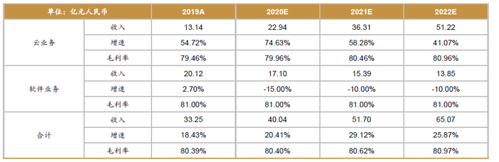营收端:云业务同比增长54.8%,营收占比达到40%。1)从收入端来看,2019年公司云服务实现营业收入13亿元,同比增长54.8%。软件业务实现营业收入20亿元,同比增长2.7%,主要原因是云产品的替代和宏观经济下行导致企业信息化采购放缓导致。2)从营收结构看,云业务的比重持续提升,由2018年的30%提升至2019的40%。3)从预收款看,2019年公司预收订阅费4.2亿同比增长89.9%。公司营收端增长整体符合预期。