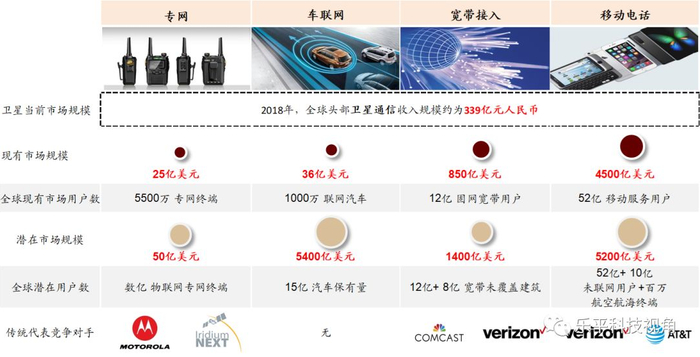 专网市场:对现有铱星等系统的一个很好升级,面对铱星、同步卫星通信速率较低、终端和资费昂贵的问题,在时延、终端价格、流量费用和覆盖方面全面领先铱星,同时可以对地面专网进行补充。