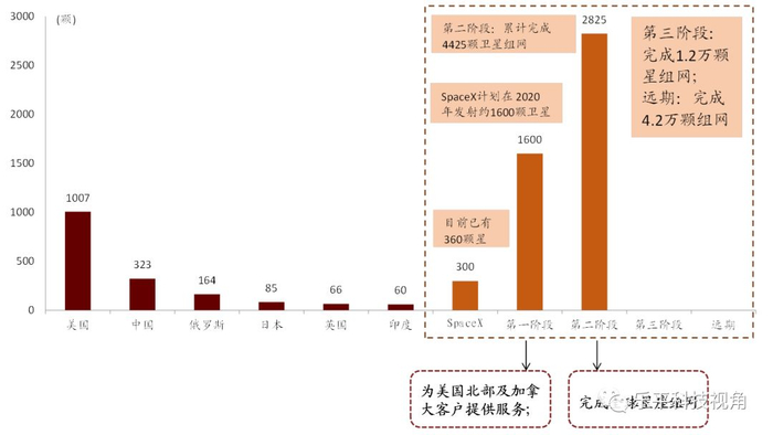 图表1:全球拥有卫星数量TOP6国家和SpaceX卫星发射计划(我们假设每月发射2次)