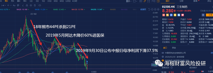 从2019年2月到2019年11月之间,市场一直在阴跌,恒生指数从33484下跌到25786,这一段的行情是股票随着指数下跌压低估值,三生制药的估值也从44PE跌到23PE.
