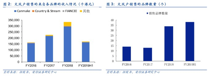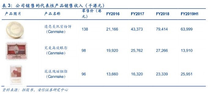 Canmake作为日本化妆品领导品牌,在亚洲拥有数百万名追捧者。该品牌于2017年获七项不同类别的Cosme美妆大赏(Cosme Best Cosmetics Awards),为日本美容行业首个于同年在日本最具影响力评级系统中获多项大奖的单一品牌。Canmake品牌是公司销售收入的主要来源:根据招股书披露,公司的销售收入主要来自于Canmake、 Country& Stream、FIANCEE三个品牌,其中2016-2018财年Canmake的销售收入占比分别为93%、93%、84%;2019财年上半年,Canmake销售收入占比提升至94.6%。公司为Mumchit香水产品及Country & Stream产品于香港、Oguma产品于香港及中国大陆、Canmake及FIANCEE产品于香港及澳门的独家分销商。此外,公司亦已获授Canmake产品于中国大陆的分销权。