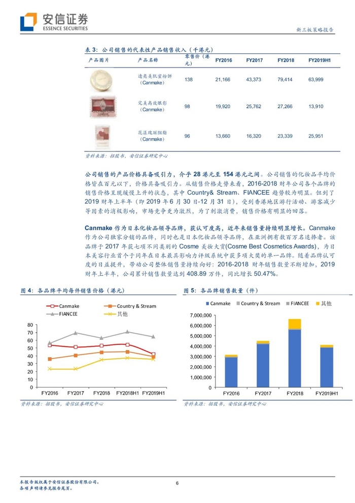 Canmake作为日本化妆品领导品牌,获认可度高,近年来销售量持续明显增长。Canmake作为公司独家分销的品牌,同时也是日本化妆品领导品牌,在亚洲拥有数百万名追捧者。该品牌于2017年获七项不同类别的Cosme美妆大赏(Cosme Best Cosmetics Awards),为日本美容行业首个于同年在日本最具影响力评级系统中获多项大奖的单一品牌。随着品牌认可度的日益提升,带动公司整体销售量持续向好:2016-2018财年销售数量不断增加,2019财年上半年,公司累计销售数量达到408.89万件,同比增长50.47%。