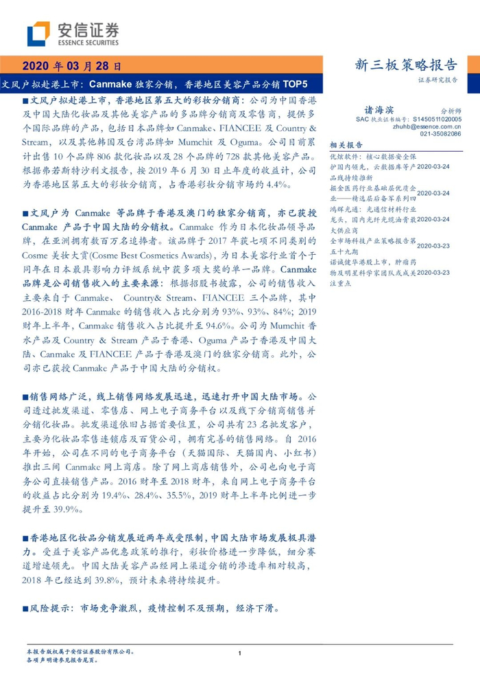 文风户拟赴港上市:Canmake独家分销, 香港地区美容产品分销 TOP5