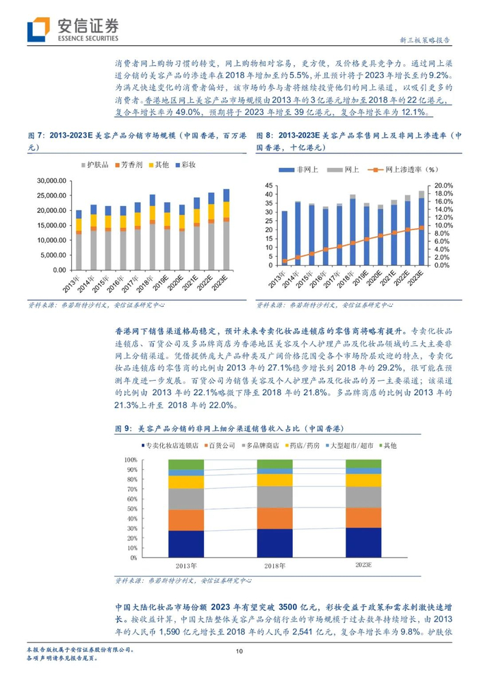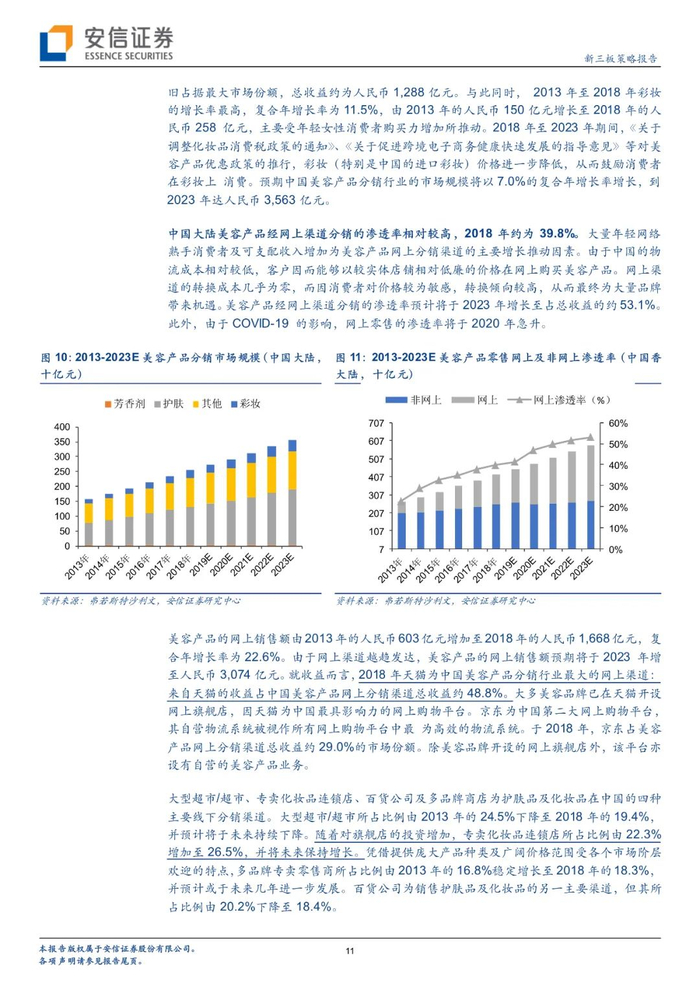受益于美容产品优惠政策的推行,彩妆价格进一步降低,细分赛道增速领先。中国大陆美容产品经网上渠道分销的渗透率相对较高,2018年已经达到39.8%,预计未来将持续提升。