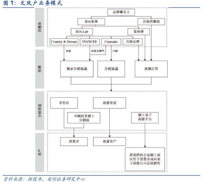 公司根据与IDA Lab订立的分销协议购买Canmake、Country & Stream及FIANCEE产品。对于IDA Lab旗下其他品牌、IDA集团旗下嘉柏荟及其他供货商提供的品牌产品,公司不时基于自身的实际需要下达订购单。当公司自供货商收到产品后,公司便会(1)出售产品予公司的批发客户,其将透过其自有的销售网络进行转售;(2)直接于公司位于香港的零售店出售产品予消费者;(3)出售产品予网上客户,透过公司的自家网上商店或直接出售予电子商务公司;及(4)透过公司于中国大陆的线下分销商出售产品。