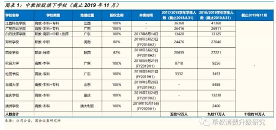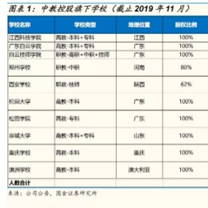 旗下九所学校,在校生人数达17万人。于2019年8月31日,中教控股在江西、广东、河南、陕西、山东及重庆六个省市经营六所高等教育学校及三所职业教育学校,在校生人数规模达17.0万人,同比增加40%(松田两校/山东学校/重庆学校共四校新并入)。