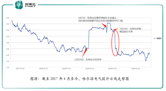 随着哈尔滨电气宣布私有化失败,公司股价也迎来了大跌。如下图所示,在宣布私有化后,哈尔滨电气股价逐步向拟注销价4.56港元靠拢。但是,随着公司宣告私有化失败后,股价如滑铁卢般下挫,跌回未私有化前的原点。