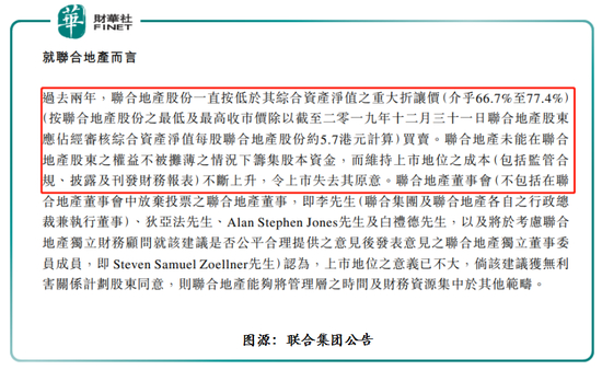 就拿联合地产(香港)私有化来讲,据4月20日大股东联合集团发布的公告显示,过去两年,联合地产股份一直按低于其综合资产净值之重大折让价(介乎66.7%至77.4%)买卖。联合地产未能在联合地产股东的权益不被摊薄的情况下筹集股本资金,而维持上市地位的成本(包括监管合规、披露及刊发财务报表)不断上升,令上市失去其原意。