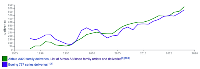 21世纪以来,在全球窄体机市场的两大系列波音737和空客A320的竞争中,空客A320系列逐渐胜出,在过去近20年的时间里,交付量力压737系列。波音在其财报中也多次将空客称为“野心勃勃的竞争者”(图表来自Wikipedia)Pierson称,波音之前对737 MAX制定的生产目标是每个月组装47架,但是,为了迅速交付更多飞机,波音将每个月的组装目标提高到了52架。