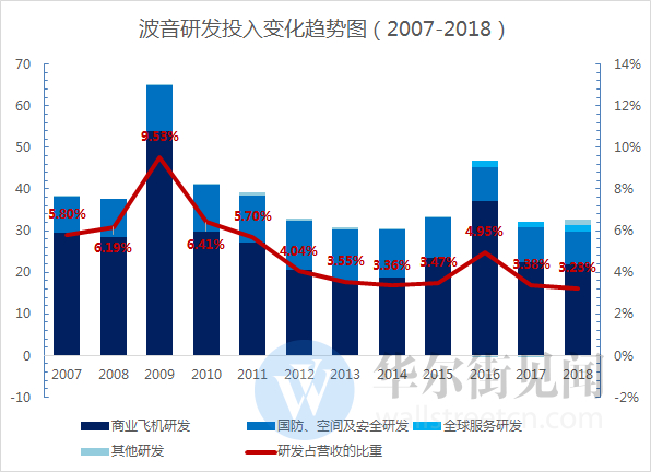 波音不断降低自己的研发费用,哪怕2011年起开始研发最新款的737 MAX系列飞机,研发投入占比也没有明显恢复;