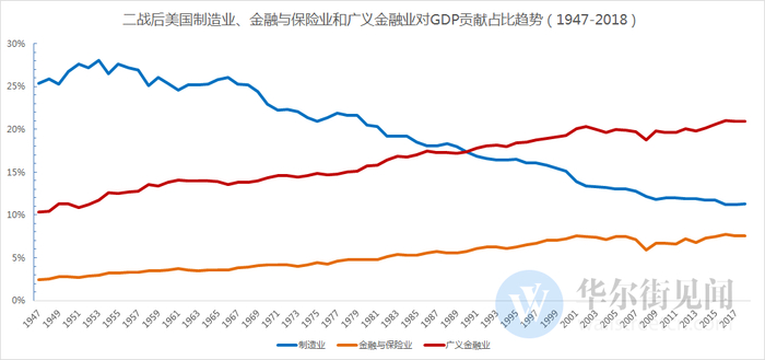 注:按照美国经济分析局的统计口径,广义金融业包括了金融、保险、房地产、租赁等产业;制造业中不包含采矿和建筑业(数据来自美国商务部经济分析局)但是,1980年代的解除管制,让金融业有了翻天覆地的变化。金融业的规模和盈利能力迅速成长,在2018年,金融与保险业对美国GDP的贡献均超过7%,包含了房地产等在内的广义金融业则在近五年连续贡献了美国20%以上的GDP。
