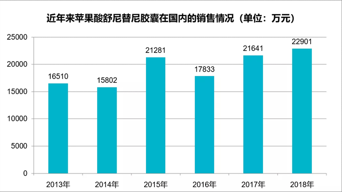 在国内,索坦的表现并不亮眼,据米内网数据近年来索坦在国内公立医疗机构的销售额整体保持在 15000 万元以上。2018 年该药经过谈判进入国家医保目录,价格由之前的 438.16 元/粒降至 155 元/粒,且去年成功续约 2019 年国家医保,预计未来随着医保放量苹果酸舒尼替尼在国内的市场潜力会进一步得到释放。