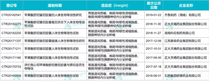但据 Insight 国内药物临床试验数据库,此次江苏豪森舒尼替尼胶囊胶囊的适应症不包括胰腺神经内分泌瘤,而另外几款获批或待审评审批的国产苹果酸舒尼替尼胶囊均包括原研索坦的所有适应症。