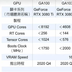 而到了RTX 3080,CUDA核心从最多8192个降低到了4608个,如此之大的差别不禁让人怀疑此爆料的真实性。不过如果结果真如爆料所说的一样的话,那就说明老黄的刀法可能是有些退步了。接下来的RTX 3070和RTX 3060分别有着3584/2560个CUDA核心、最多112/80个RT核心以及1900MHz/2000MHz的Boost频率,将分别在今年第三季度和明年第一季度推出。