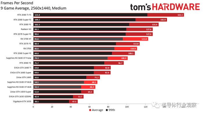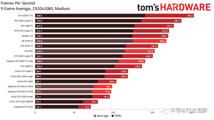 AMD的主流产品至少取得了胜利,其中RX 5700在使用相同功耗的情况下,其性能击败了RTX 2060,在使用更少功耗的情况下也仅次于2060 Super这不是一场重大的胜利,但总比失败要好。同样,5600 XT比RTX 2060性能稍好一些,但功耗稍低一些(没错,这是使用了14 Gbps GDDR6更新的性能)。