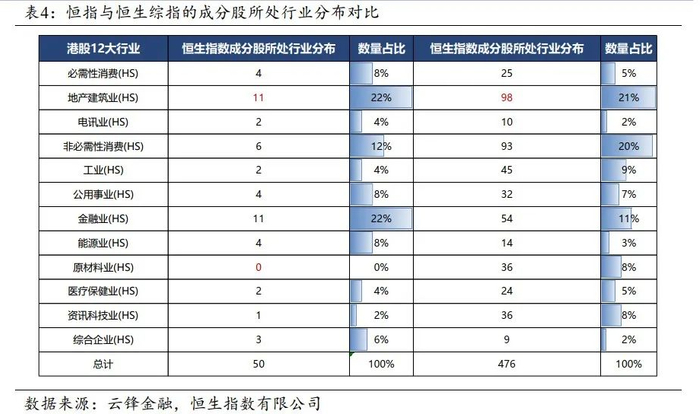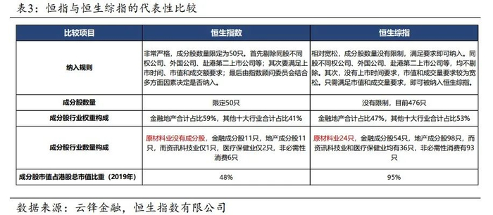 虽然恒指被广泛引用,但近年来代表性下降。与恒生指数相比,恒生综合指数覆盖的公司数量多,覆盖的公司总市值规模大、代表性更好。恒生综合指数中,资讯科技业、非必需消费等行业占比高于恒生指数。