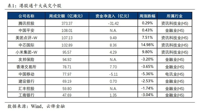 港股通前十大成交个股上周表现、资金净流入情况如下: