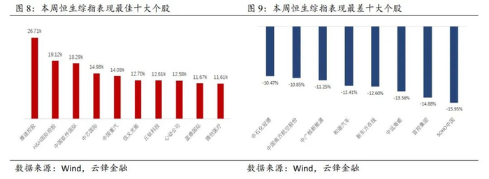 个股方面:上周,恒生综指476只成分股多数收跌(收涨或持平226只VS下跌250只)。其中表现最佳的前三个股是雅迪控股(+26.71%)、H&H国际控股(+19.12%)和中国软件国际(+18.29%);表现最差的是SOHO中国(-15.95%),其次为首控集团(-14.88%)和中远海能(-13.56%)。