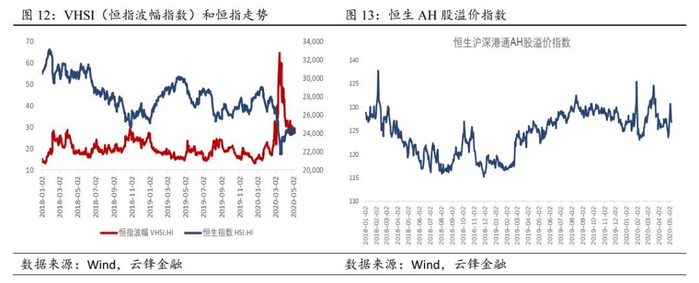 上周恒指波幅指数(VHSI)收于27.38,按周环比上升2.47%,对比3月16日的历史高点64.8,已经大幅下降58%,虽仍处于近三年来的高位,但市场极度悲观的情绪已大幅缓解。