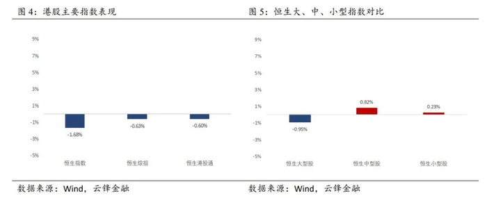 上周恒生各大细分指数涨跌不一。综合指数中,恒生港股通表现相对最好,恒生综指通次之,恒指表现相对最差。规模指数中,恒生中型股和恒生小型股均录得正收益,涨幅分别为0.82%和0.23%;大型股表现最差,录得0.95%的负收益。
