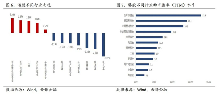 从各行业估值来看,不同行业间的估值差异仍然较大。其中,医疗保健业继续超越资讯科技业,成为估值水平最高的行业,市盈率高达35.9倍;估值水平最低的综合业,市盈率仅为4.8倍。除医疗保健业、资讯科技业、必需性消费业和非必需性消费业外,其他八大行业的市盈率均低于15倍。