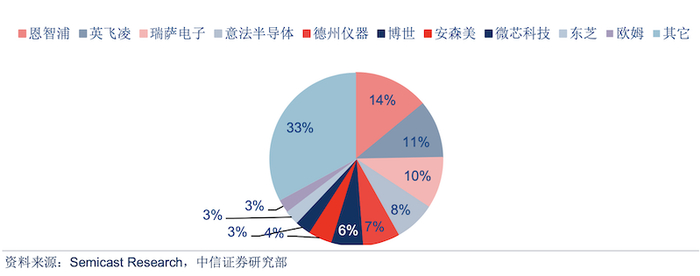 根据中心证券的一份报告,2016年汽车MCU微控制器的市场份中,仅恩智浦、英飞凌、瑞萨、意法半导体、德州仪器五个玩家,就已经占据了超过70%的市场份额。