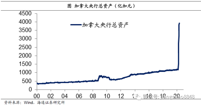 其中最夸张的是加拿大央行,其最新资产规模为3920亿加元,比去年末的1194亿加元增加了2726亿加元,资产规模扩张了2倍还多。