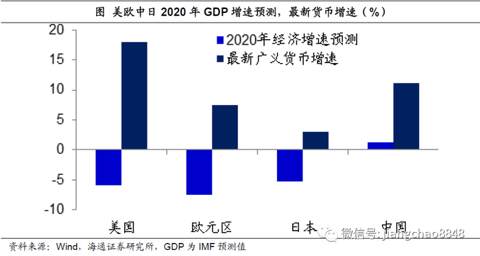 问题在于,虽然货币印出来了,各国的广义货币增速大幅回升。但由于病毒无法根除,卫生事件没法完全结束,因而经济无法完全恢复正常。根据IMF的最新预测,今年全球经济或将同比萎缩3%,其中欧美国家普遍出现负增长。因此,一方面是广义货币激增,另一方面是实体经济下滑,这意味着相对于经济而言,货币肯定是发多了。反过来说,这也意味着全球货币相对于过去都有贬值的压力。