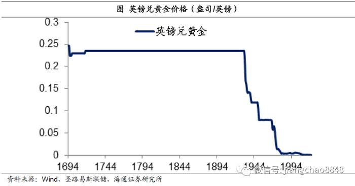 在现存的主要货币中,英镑的历史最为悠久,其诞生于1694年,由当年成立的英格兰银行发行。英镑诞生之初,1英镑可以兑换0.25盎司黄金,但目前1英镑只能兑换0.0007盎司黄金。也就是说,在英镑诞生以来,其对黄金已经贬值了99.7%,平均每年贬值1.8%。