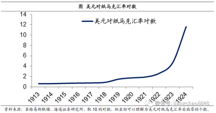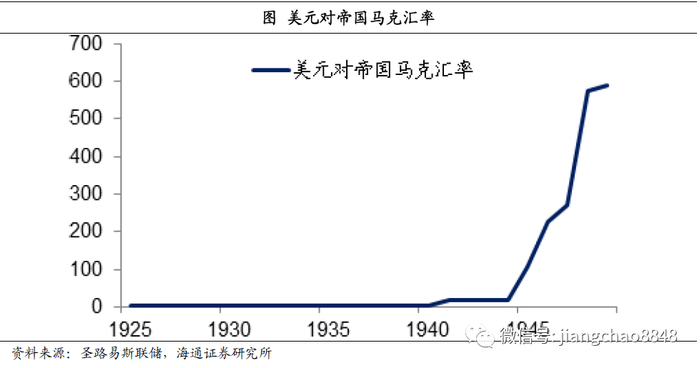 以美元对德国马克的汇率来测算,从1914年到1999年,美元对马克升值了5万亿倍,相当于德国马克兑美元每年贬值了30%。再考虑到美元对黄金的贬值,德国马克对黄金贬值的幅度还要更多。