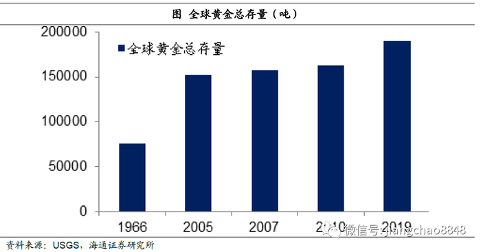 根据美国地质调查局的数据,1966年时全球黄金总存量为7.6万吨,到2019年上升至19万吨左右,平均每年增长1.7%。同样是根据美国地质调查局的数据,2019年全球金矿产量为3300吨,比前一年的总存量增长大约1.7%。