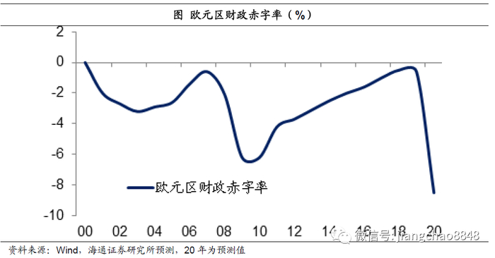 根据欧盟委员会的最新预测,欧元区整体预算赤字率将从2019年的0.6%升至2020年的8.5%,其中意大利、西班牙的赤字率将超过两位数,而法国赤字率也将接近10%。与此同时,欧央行今年以来的资产已经增长了7600亿欧元,占其19年GDP的6.4%,如果把这一速度年化,欧央行今年购买资产规模或许也会接近欧元区GDP的20%。