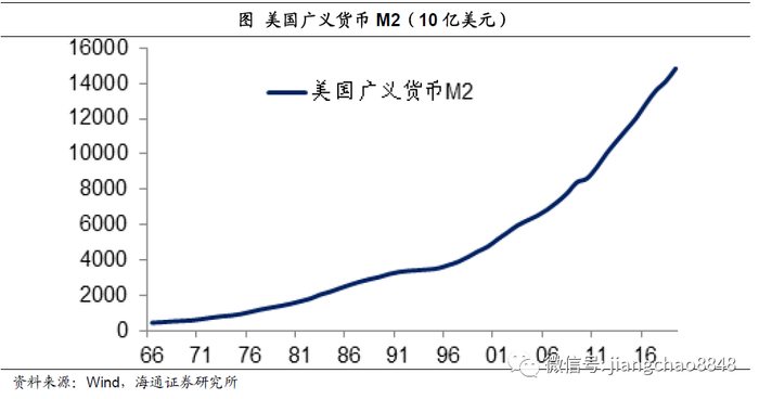 相比之下,从1966年到2019年,美国的广义货币M2从4700亿美元增长至14.8万亿美元,增长了30倍,平均每年增长6.7%。