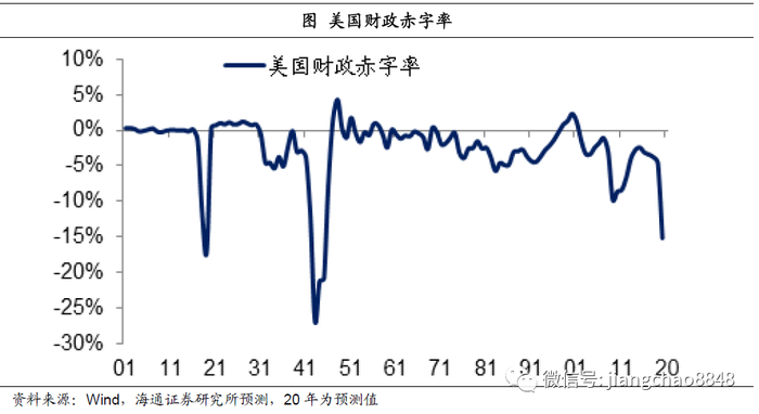 而且前四轮的财政刺激很快就要花完了,目前美国又一次提出了第五轮3万亿美元的财政刺激计划,估计未来还是要靠央行印钞来买单。如果所有这些财政刺激全部实施的话,美国今年的财政赤字率可能会突破30%,而且这些财政赤字将全部货币化,直接转化为广义货币。