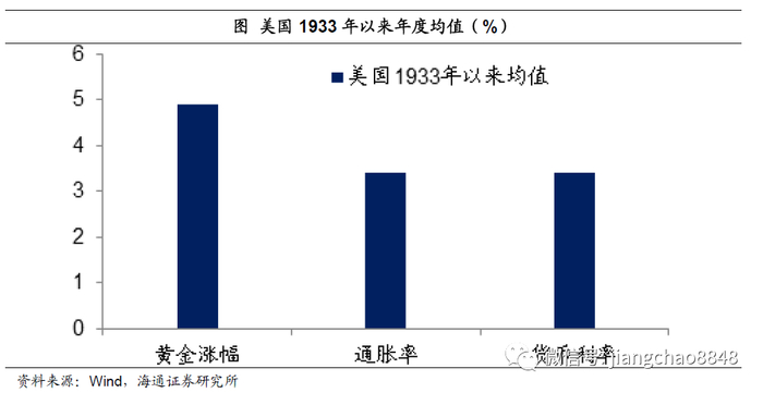 1933年,美国首次放弃金本位,此后黄金对美元的年均涨幅为4.9%,同期美国的年均通胀率为3.4%,短期国债利率均值也为3.4%。因而在美国黄金同样跑赢了通胀,而现金类资产回报率仅与通胀率持平。