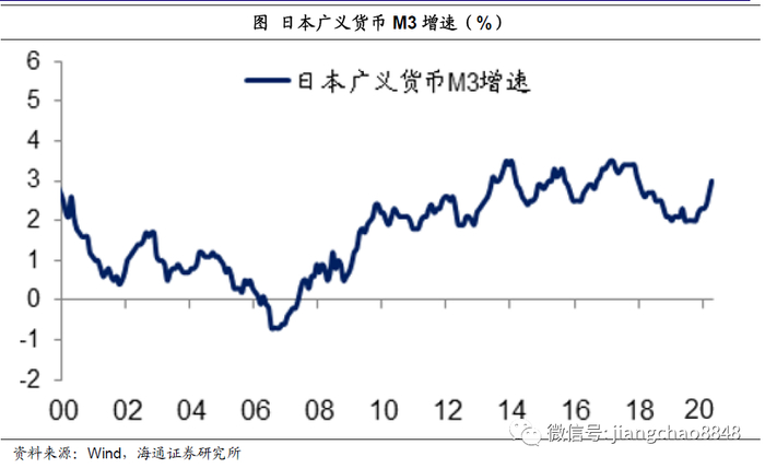 央行量化宽松所释放的是基础货币,通常只在金融体系内部循环。而要对经济产生影响,则必需创造出广义货币。日本的问题在于未能创造出足够的广义货币,从2012年日本央行重启QE至今,其央行总资产扩张了3.3倍,年均增长20%,但同期日本的广义货币M3年均增速仅为2.7%。