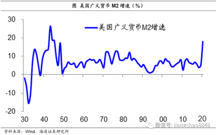 因此,欧美各国财政赤字率的大幅飙升,叠加量化宽松的货币政策,相当于通过财政赤字货币化,央行和财政部联手直接创造出了大量的广义货币。