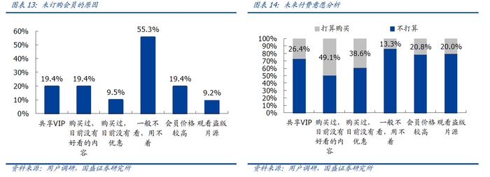这意味着:(1)未来单纯依靠拉新的会员增长将有所放缓。本次调研共273名用户未订阅付费会员,其中表示未来打算订购VIP服务的仅占24.2%。不常使用长视频(55.3%)是未成为付费会员的主要原因;