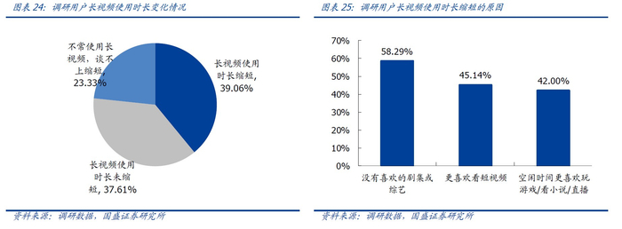 短视频在崛起过程中一定程度上侵蚀了长视频的用户使用时长,目前短视频使用时长占比(15%)已超过在线视频(11%)。调研数据也反映出同样的结论,39%的用户使用长视频的时间有所缩短,其中有45.1%的用户因为更喜欢短视频而相应减少了长视频的使用时长。但是,内容仍为驱动长视频用户使用的关键因素,超过半数(58.3%)的用户因为没有喜欢的剧集或综艺而减少长视频使用时长。
