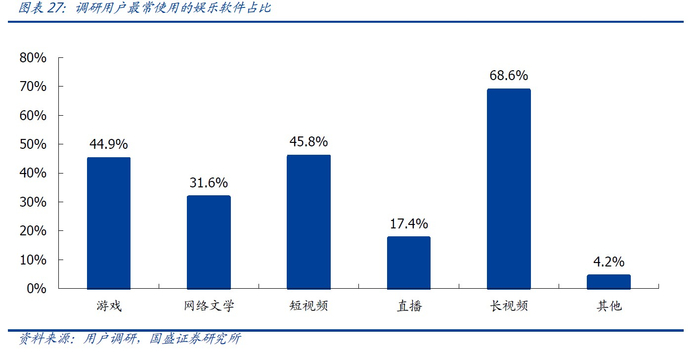 从使用场景和内容价值两维度来分析长短视频,我们可以发现两种形态实质上“互补”地满足了用户需求,长期来看,短视频对长视频的时长冲击会逐步趋缓。短视频满足了人们碎片化时间、视频社交的娱乐场景,而长视频能更好地在合家欢、长段时间沉浸化娱乐场景发挥作用。此外,由于内容的长度和形式限制,高效率低成本生产短视频成为可能,但也产生了内容质量较低和内容同质化严重的问题;长视频制作周期较长成本较高,高内容价值能满足用户的特定化需求,也更有机会塑造IP发展内容衍生产品。从调研数据看,长视频仍是使用人数最多、最主流的娱乐方式。896份效调研问卷中,68.6%的用户选择长视频作为最常用的娱乐方式,占比远高于短视频(45.8%)和游戏(44.9%)。