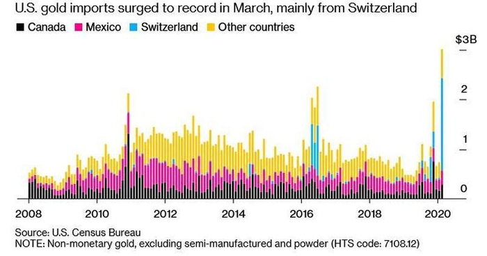 这些黄金大部分来自瑞士。瑞士对美国的黄金出口量激增,4月份达到创纪录的111.7吨。根据美国人口普查局(Census Bureau)的数据,3月份美国黄金进口量已经超过30亿美元,为至少10年来的最高水平。