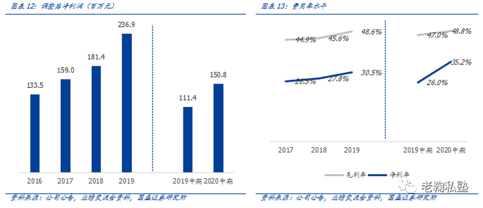 调整后净利润增长亮眼,毛利率净利率双双提升。剔除上市费用等非经常性损益后的调整后净利润增长亮眼,2020H1实现调后净利润1.5亿元,同比增长35.4%,盈利水平实现持续提升,2020H1毛利率、净利率分别提升至48.8%(yoy+1.8pp)、35.2%(yoy+9.2pp)。