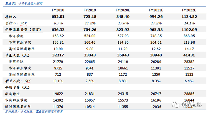 营业收入:FY2019/FY2020H1公司营收同增11.2%/18.9%至7.25/4.18亿元,基于对旗下学校学生人数及平均学费的分别估计,我们预计公司FY2020-FY2022总营收分别为8.48/9.94/11.35亿元,同增17.0%/17.2%/14.1%。