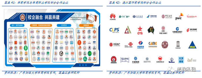 校企合作广泛,产教融合助力学生就业。公司旗下学校已与100+优质企业建立合作关系,通过产教融合的教学培养模式提高学生就业竞争力,旗下国内高等院校就业率95%+显著优于行业水平,2019年华商会计学院毕业生108人进入2019年中注协国内前50大会计师事务所工作。