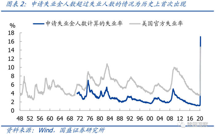每周申请失业金数据通常是市场预测失业率的重要依据,该数值测算的失业率往往比官方失业率低3%左右,原因在于部分就业者没有失业保险或者失业后并未主动申请失业金。但5月16日根据申请失业金人数计算的失业率为14.8%,高于5月官方失业率13.3%,这种情况为历史上首次出现。原因可能在于,3月12日联邦政府已允许各州修改法律以灵活发放失业金,各州可能已经普遍放宽了失业金领取条件并扩大了失业金发放范围,从而导致申请失业金人数超过了调查统计的失业人数。