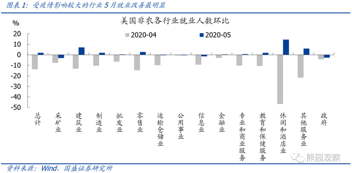 美国5月非农报告的调查时间为5月16日前一周,截至5月15日,美国已有31个州+DC特区结束“禁足令”,这些地区的GDP合计占比为62.4%。与4月相比,5月暂时性失业人数下降272万,反映了经济重启后,一些岗位的工人被雇主召回。分行业来看,前期受卫生事件影响较大的休闲和酒店、教育和保健服务、其他服务、建筑、零售等行业在5月就业状况改善最为明显。
