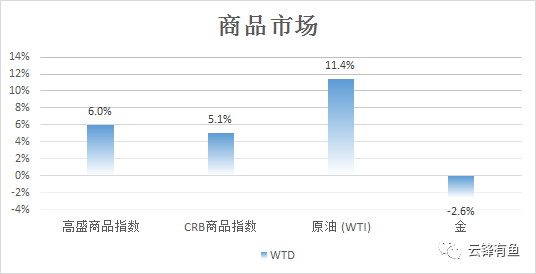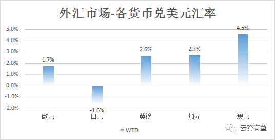 全球股市中上周涨势最猛的是欧洲斯托克50指数,录得11%的涨幅。WTI原油上周上涨11.4%,这与风险资产的反弹有关,而避险属性的金银等贵金属以及日元都有不同程度的跌幅。