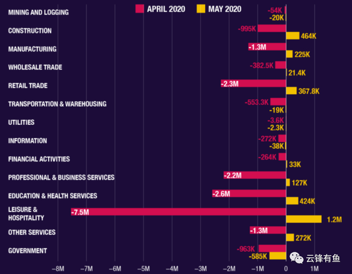 虽然新增数据喜人,但5月份的新增较4月的减少来看只是一小部分。而且,并非所有行业的就业都在反弹。公共事业、交通运输、采矿业和信息行业都出现就业继续减少的情况,最惨的政府部门降幅最大,继上月裁员96.3万人次后继续减少58.5万人。