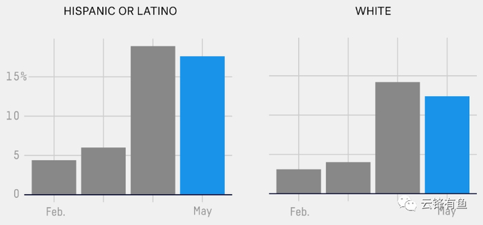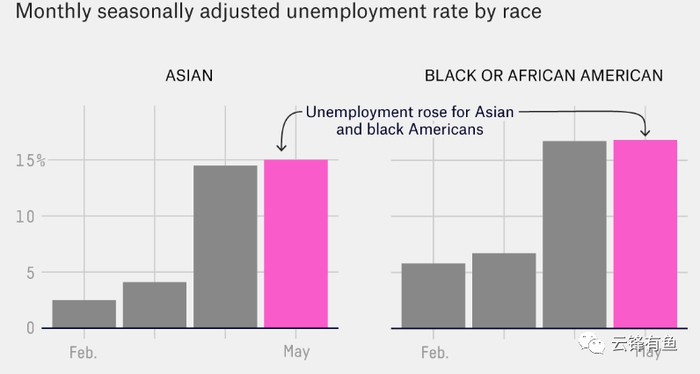 而且,虽然总体失业率在减少,但黑人工人(尤其是黑人女性)的失业率实际上从4月到5月是上升的,这也加剧了工人失业的种族差距。