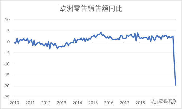 商业活动几乎崩溃,欧元区4月份零售消费同比下降19.6%,在3月-8.8%降幅的基础上进一步下滑。